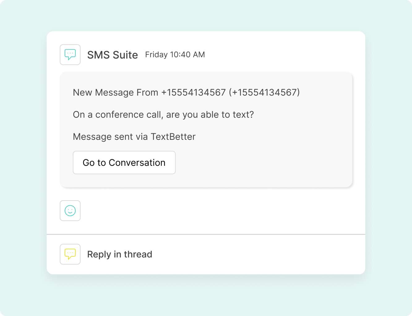 Yes. SMS Suite can post real-time notifications into MS Teams or Slack channels so employees don’t miss incoming messages and relevant information.