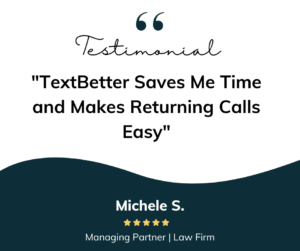 You can expedite several tasks by using text messaging for your law firm. For example, one of our customers, Michele, a managing partner, says, “TextBetter saves me time and makes returning calls easy.” TextBetter makes returning calls easier, and you can text billing updates or past-due balance reminders.